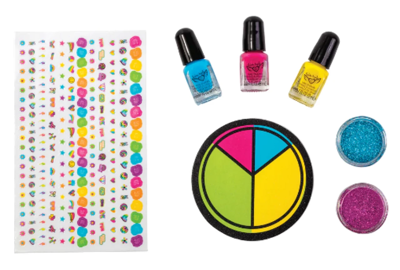 Use the included 5 colours of polish, press-on nails and tool to create rainbow coloured effects.
