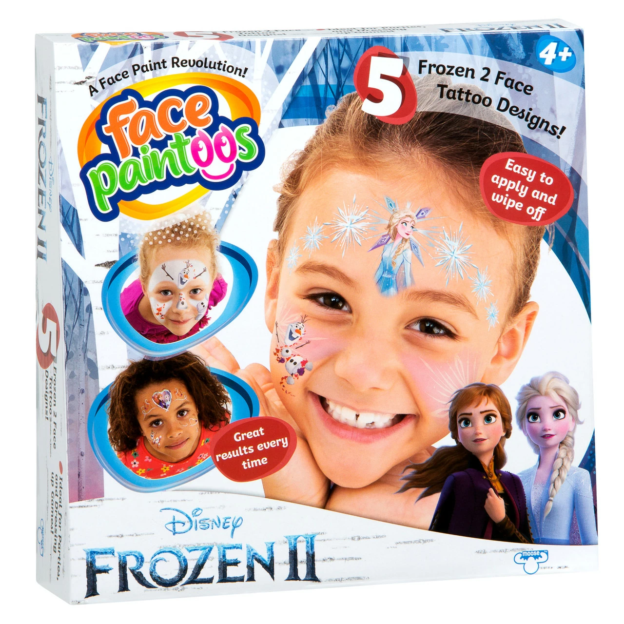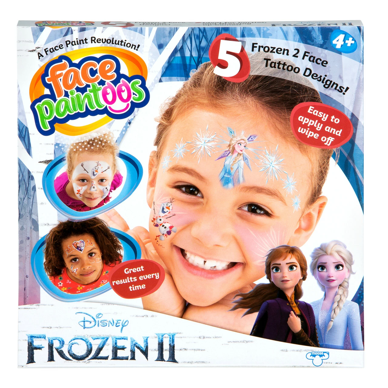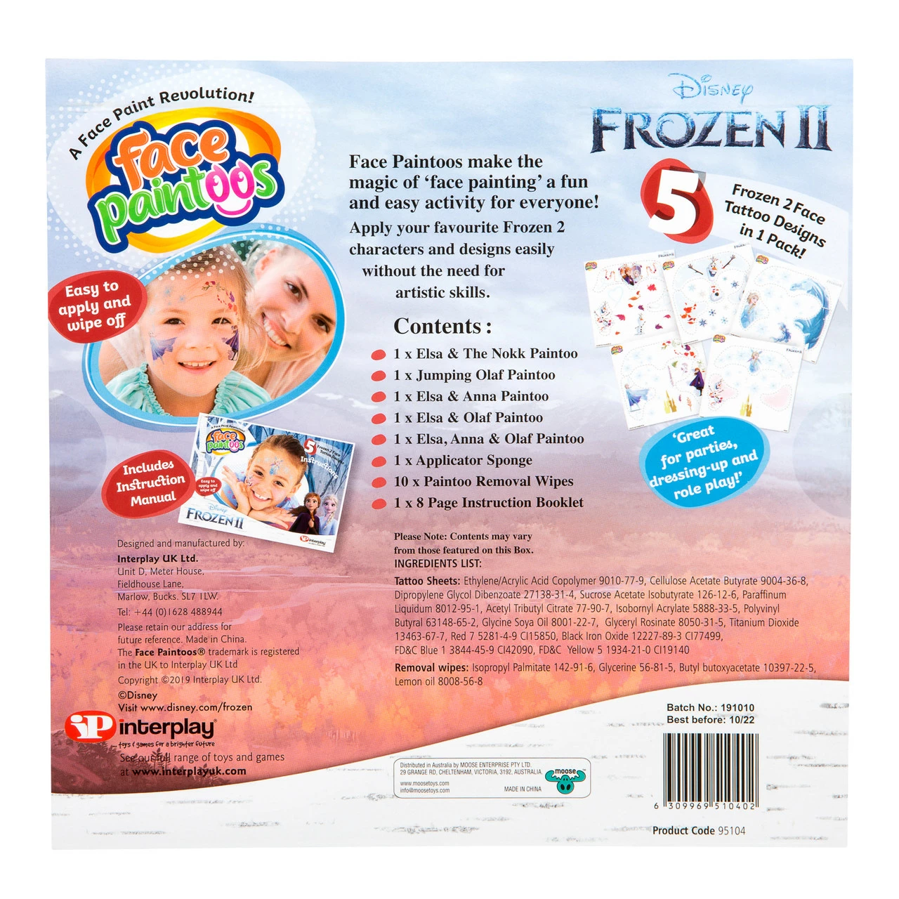 • Disney Frozen 2 Pack. Includes 5 Face Tattoo Designs including your favourite Frozen 2 Characters – Elsa and The Nokk, Anna and Olaf!