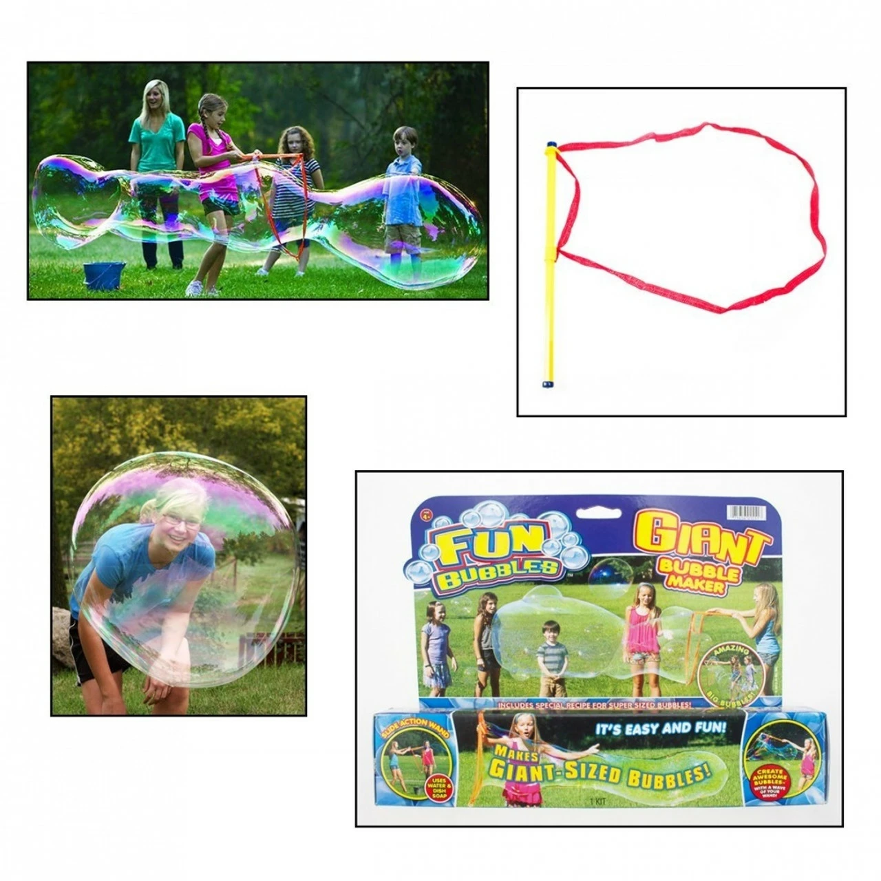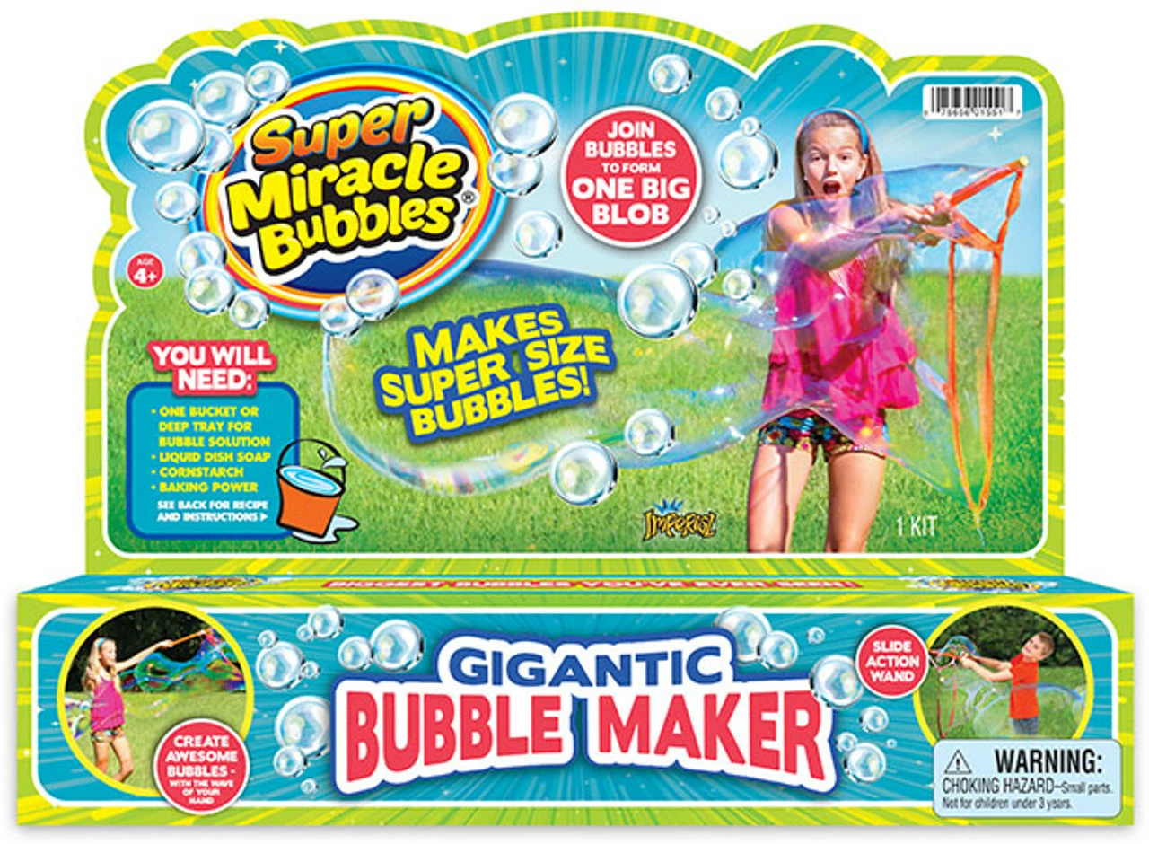 Giant bubble maker makes super size bubbles with slide action wand.