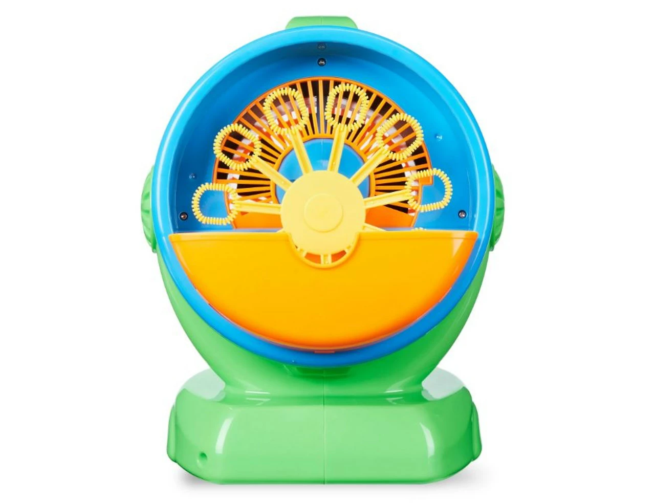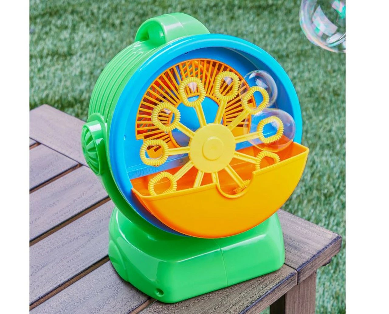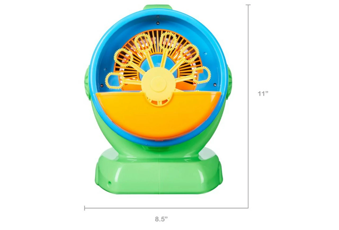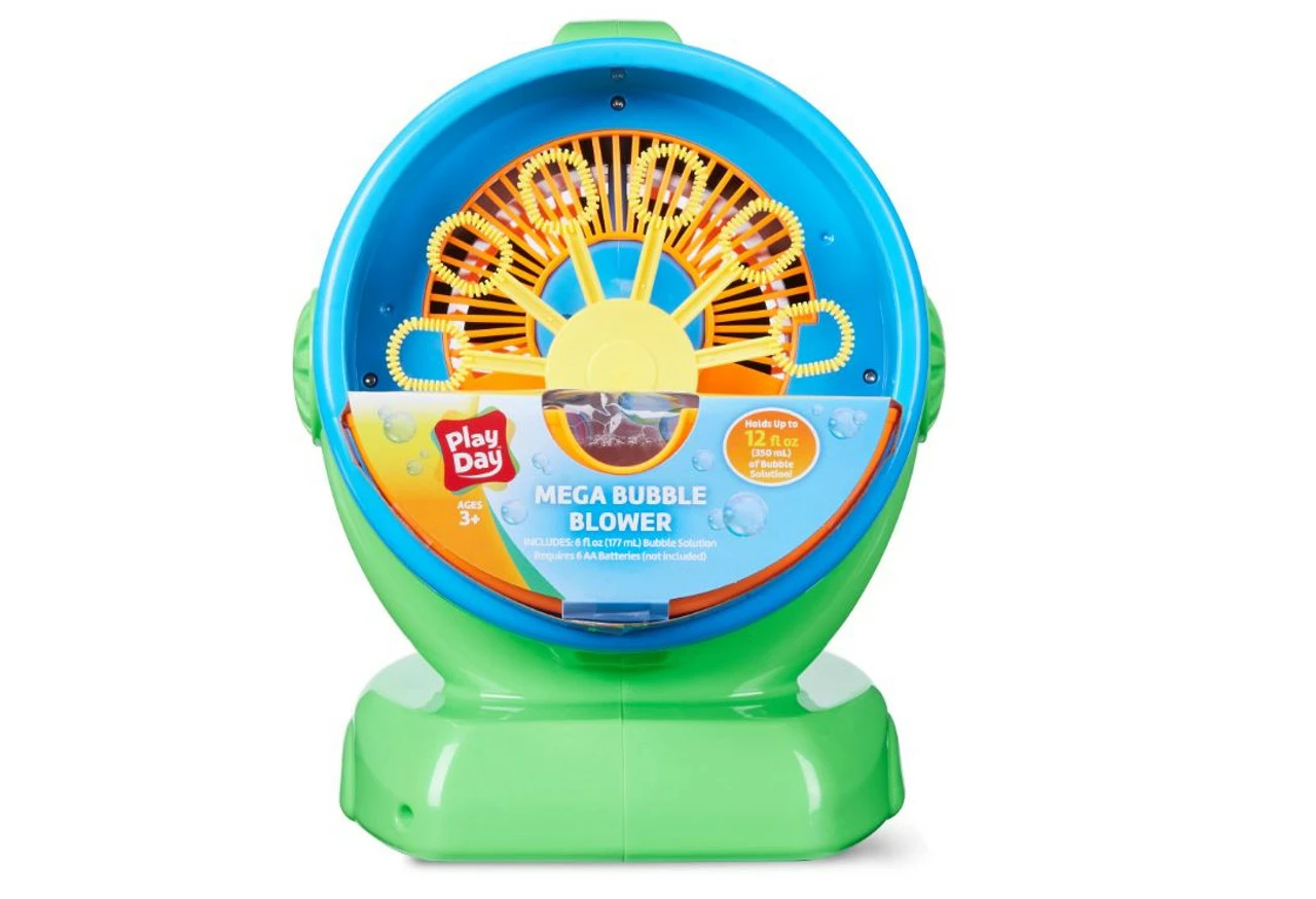 Blower. Turn this bubble blower on and watch as a plethora of bubbles float through the air. Set the bubble blower on a table at a cookout, at a birthday party, or when spending the day playing outside. It can hold up to 12-ounce of bubble solution, so you can enjoy the bubbles for hours. It includes six fluid ounces of bubble solution and the bubble blower. While usage is intended for children ages three and up, it is perfect for kids of all ages to enjoy watching and popping bubbles. It requires six AA batteries (not included) and measures 8.5 inches by 11 inches. Blow friends and family away with the Play Day Mage Bubble Blower. Check out other Play Day toys like the Play Day Bubble Blower Fan, Play Day Bubble Leaf Blower, Play Day Bubble Blaster, and more.