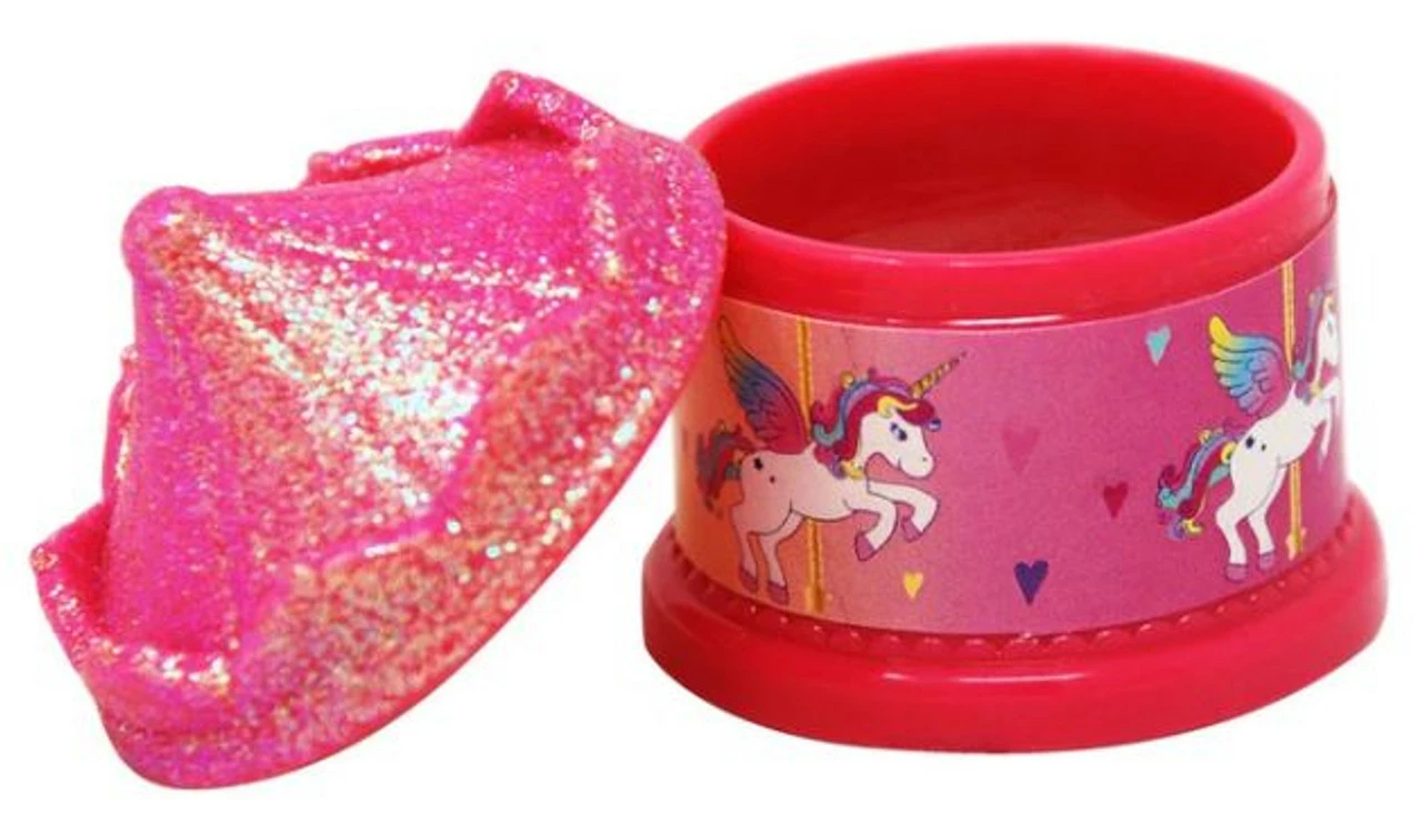 Add a touch of colour and shine to your lips with Pink Poppy’s Unicorn carousel lipgloss. Cute carousel shaped container Bubblegum scented Sheer pink colour Packaging: 100% ABS plastic Screw top 4.1W x 4.5H x 4.1D cm Ages 3+